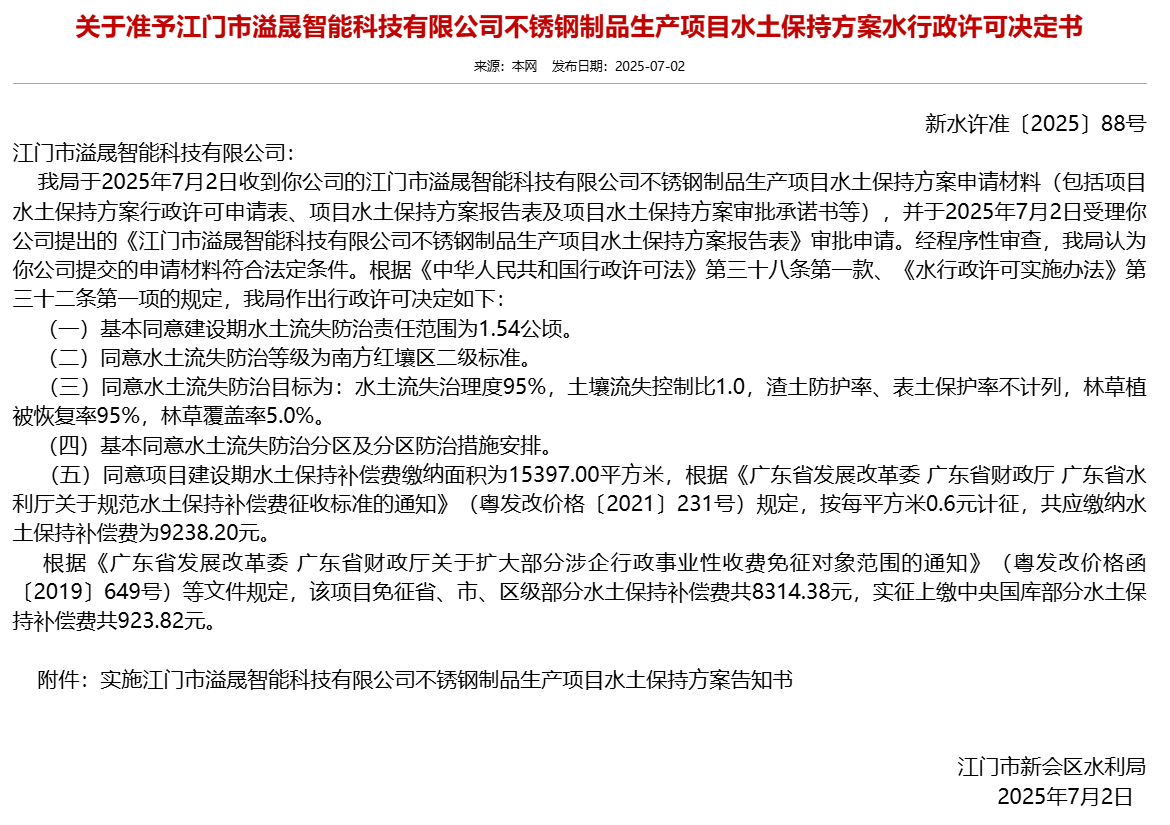 2025年7月2日,江門市新會區水利局準予江門市溢晟智能科技有限公司不銹鋼制品生產項目水土保持方案水行政許可決定書。