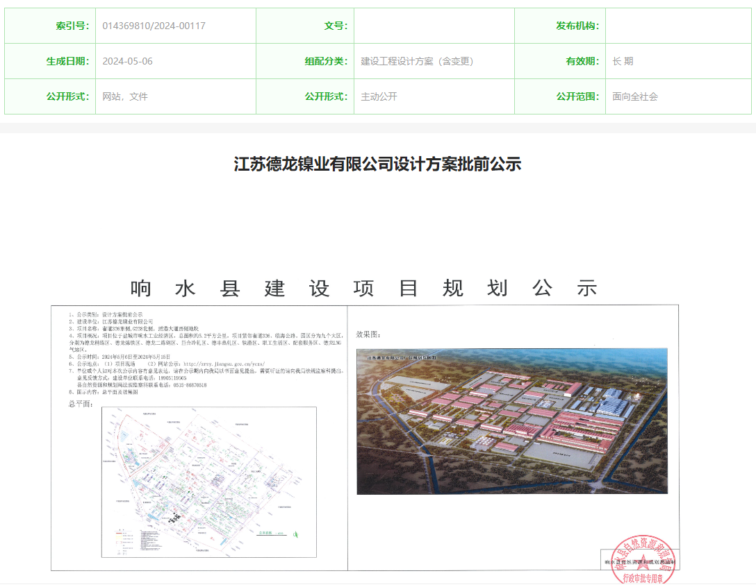 5月6日,江蘇德龍鎳業有限公司設計方案批前公示,公示時間:5月6日-5月15日。