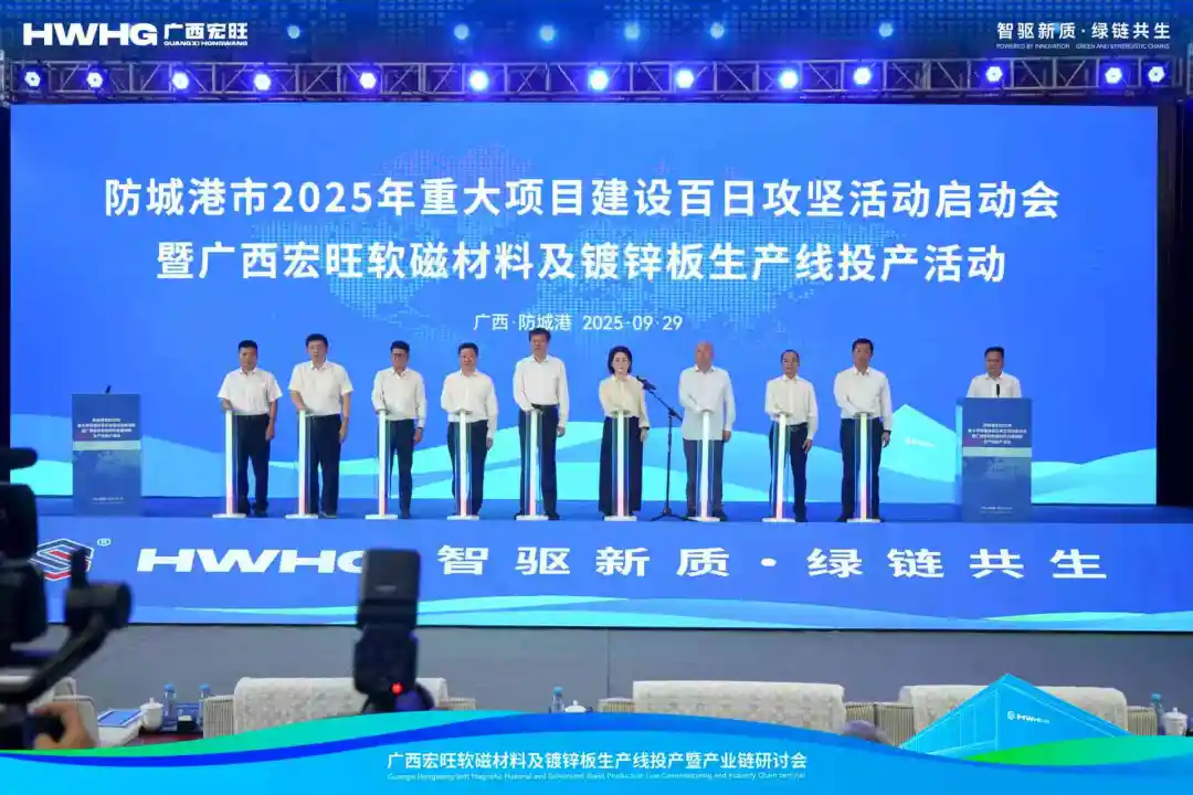 9月29日,廣西宏旺軟磁材料及鍍鋅板生產線投產活動隆重舉行。自治區黨委常委、自治區常務副主席許永錁出席活動,防城港市委書記黃江,市長邱明宏,市政協主席梁宗勇,自治區地質礦產勘查開發局局長、自治區實體經濟服務員工作隊駐防城港市工作隊隊長黎四龍,湖南省婁底市政協主席梁立堅,自治區發改委、工信廳、園區辦、防城港市四家班子及相關單位負責同志,行業協會專家、各金融機構、各戰略合作單位,以及項目合作股東廣西盛隆冶金有限公司總經理柯雪利、經營總裁林能鏡,宏旺控股集團董事長、總裁戴促輝,集團副總裁朱繼喬、高志策、劉慧丹等領導嘉賓共同參與本次活動。防城港市委常委、常務副市長陶德文主持儀式。