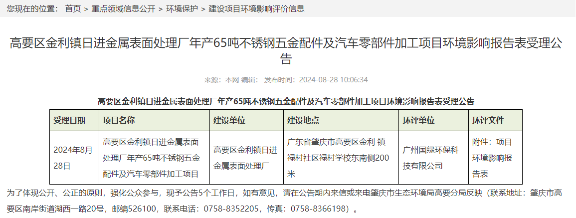 8月28日,肇慶市高要區(qū)金利鎮(zhèn)日進(jìn)金屬表面處理廠年產(chǎn)65噸不銹鋼五金配件及汽車零部件加工項(xiàng)目環(huán)境影響報(bào)告表獲受理公告,公告期:5個(gè)工作日。