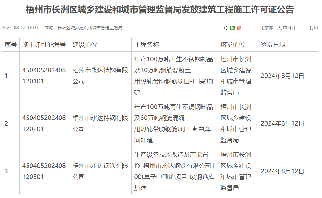 8月12日,梧州市永達(dá)特鋼有限公司年產(chǎn)100萬(wàn)噸再生不銹鋼制品及30萬(wàn)噸鋼筋混凝土用熱軋帶肋鋼筋項(xiàng)目廠房3加建、制氧車間加建以及100t量子電弧爐項(xiàng)目廢鋼倉(cāng)庫(kù)加建均獲建筑工程施工許可證。